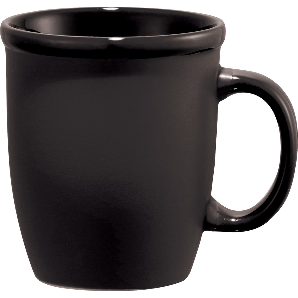 Cozy ceramic mug with a regal matte finish and a glossy inner, lip, and handle. Choose between color imprinting or our cutting edge dishwasher safe laser decorating method. 12oz.