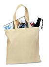 A light compact basic carryall tote at a great value. 100% cotton sheeting Reinforced stitching on handles Dimensions: 15.75 h x 15.25 w Handle Length: 21.5 Note: Bags not intended for use by children 12 and under. Includes a California Prop 65 and social responsibility hangtag.